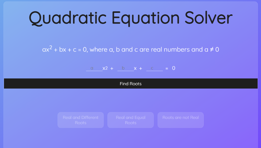 This is quadratic equation solver application which can find real or imaginary roots of a valid quadratic equation. This app has a simple ui and build using HTML, CSS, SASS and Vanilla JavaScript.